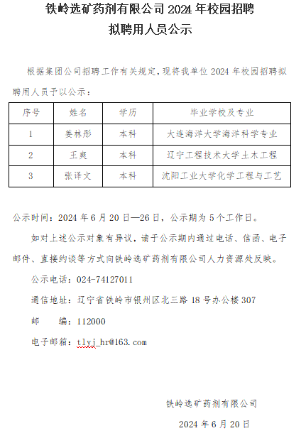 鐵嶺選礦藥劑有限公司2024年校園招聘 擬聘用人員公示