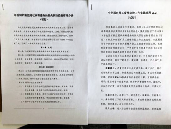 中色國礦建章立制加強疫情防控工作 中色國礦編撰了《新型冠狀病毒感染的肺炎預防控制管理辦法》和《疫情防控工作實施流程》等相關制度辦法,為節后上班疫情防控提前做好安排。面對疫情可能對生產經營可能產生的影響,制定了工作預案,提前做好境外物資采購渠道備份溝通。積極響應集團公司倡議,迅速組織員工捐款捐物,為疫情防控貢獻力量。